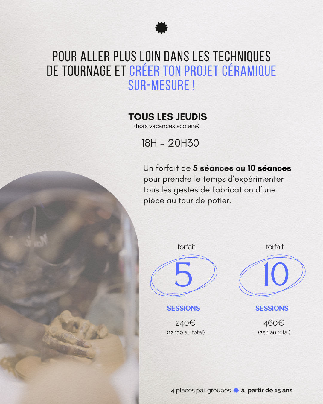 Tu as une pratique en tournage et souhaite te perfectionner ? Grâce à l’organisme Pass Passion, tu vas pouvoir passer 3 semaines (continue ou discontinue) avec moi à l’atelier pour peaufiner tes connaissances du tournage et te familiariser avec les épreuves du CAP tournage céramique. La formation est éligible aux financements CPF, FAF, OPCO, France travail…